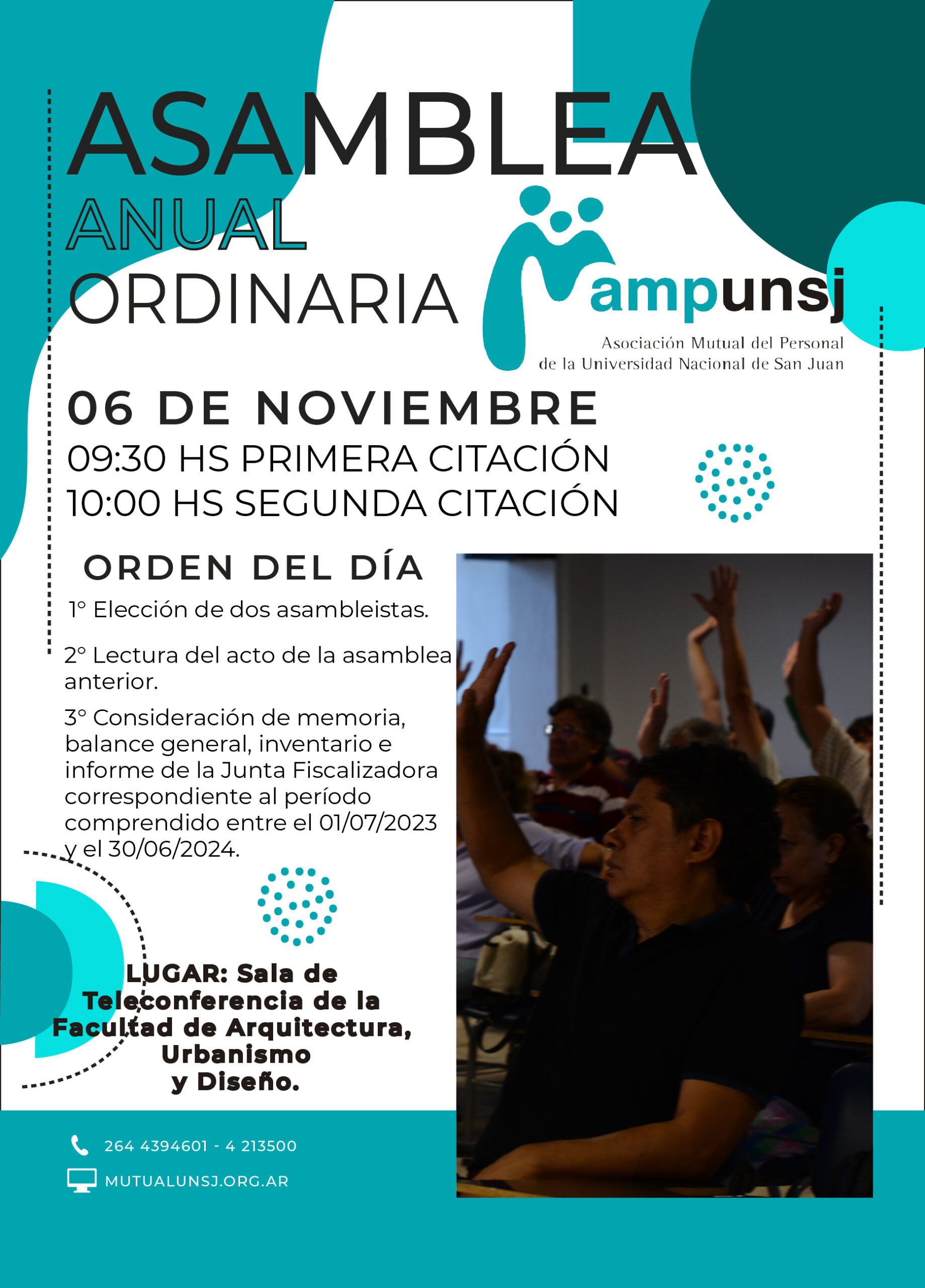 Convocatoria a Asamblea Ordinaria a los asociados y asociadas de la ASOCIACIÓN MUTUAL DEL PERSONAL DE LA UNIVERSIDAD NACIONAL DE SAN JUAN