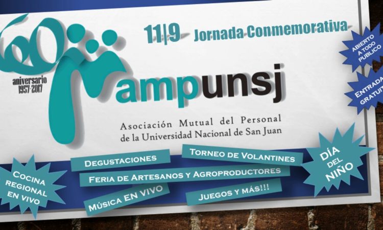 La Asociación Mutual del Personal de la UNSJ invita a socios, miembros de la comunidad universitaria y público en general a las actividades programadas en conmemoración del 60º Aniversario de la institución, que tendrán lugar el próximo lunes 11/09 (feriado) a partir de las 11 hs. en el Camping, Ruta 40 y calle 8, Pocito.